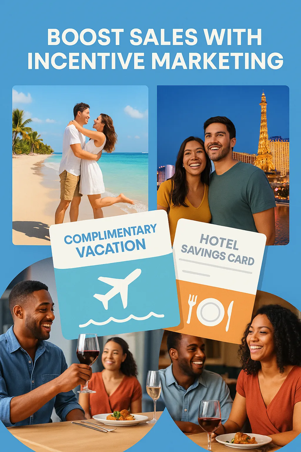 Close more deals and boost engagement with our exclusive Incentive Program. Offer your leads complimentary vacation getaways, hotel savings cards, or dining vouchers to drive conversions and loyalty. With hundreds of destinations worldwide, we give you the power to create irresistible offers—complete with videos, landing pages, and automation built into your Epic Platform.